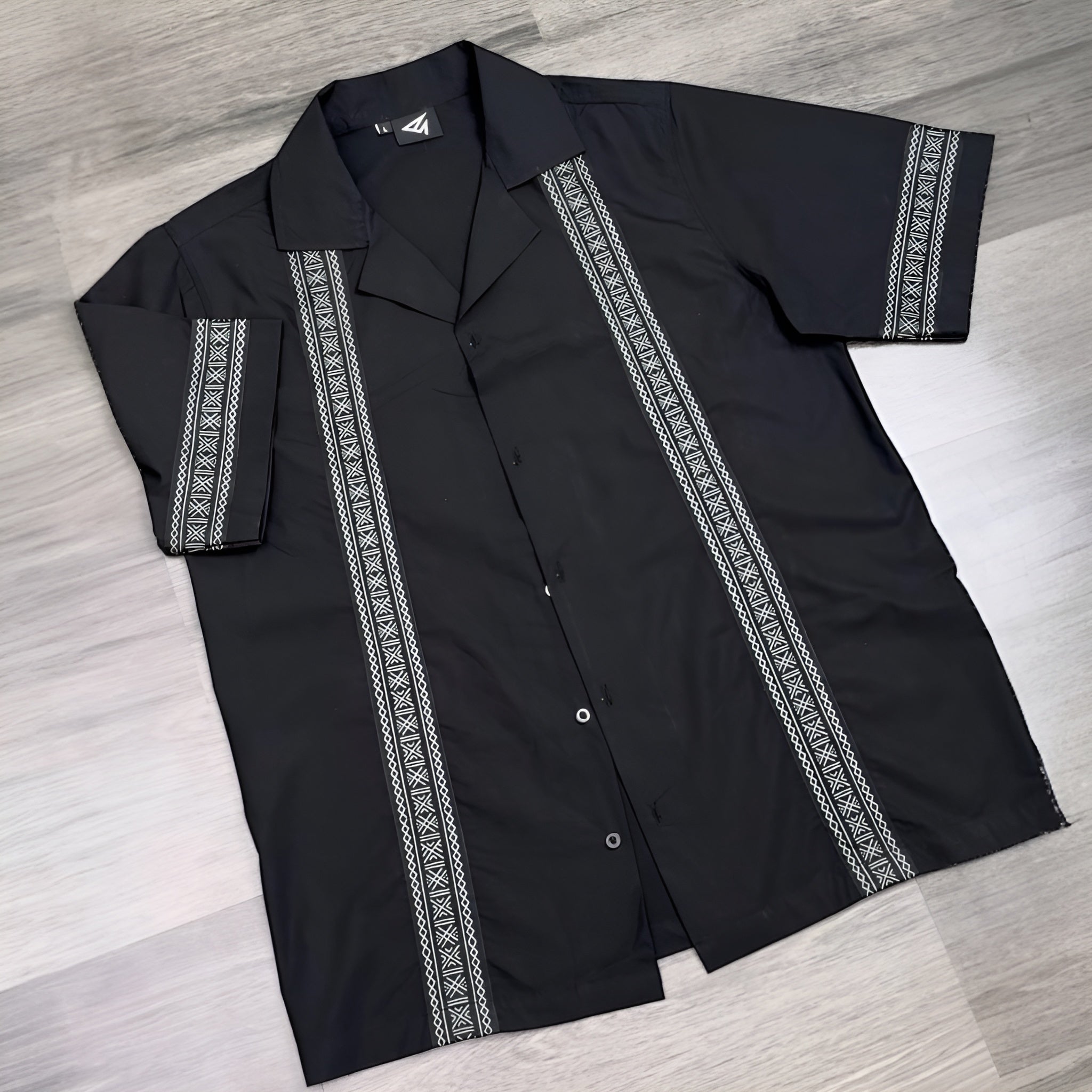 This embroidered black safari  short-sleeve shirt features subtle tribal accents, adding an edge to your everyday look. A...