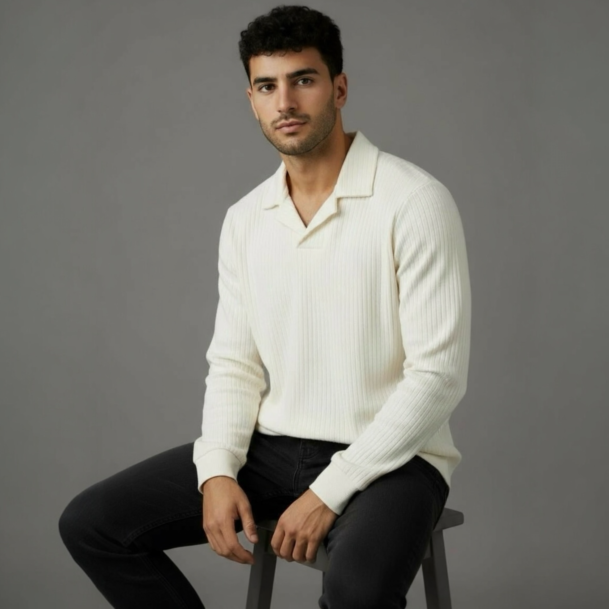 A refined knit shirt in a soft pearl hue designed with stretch for an easy, comfortable fit....