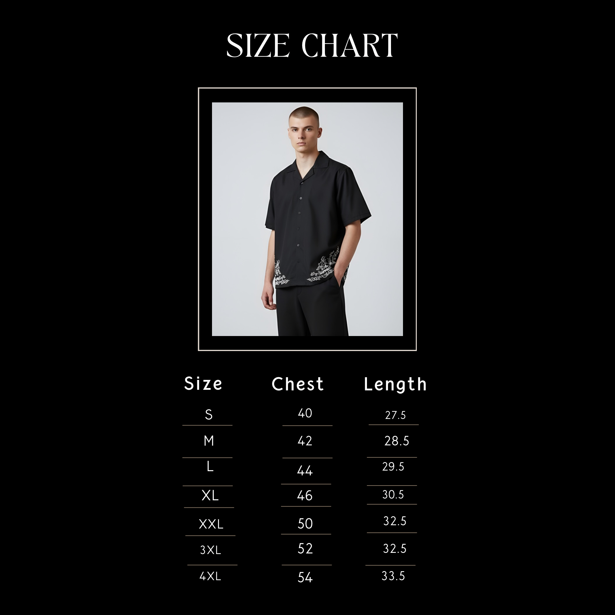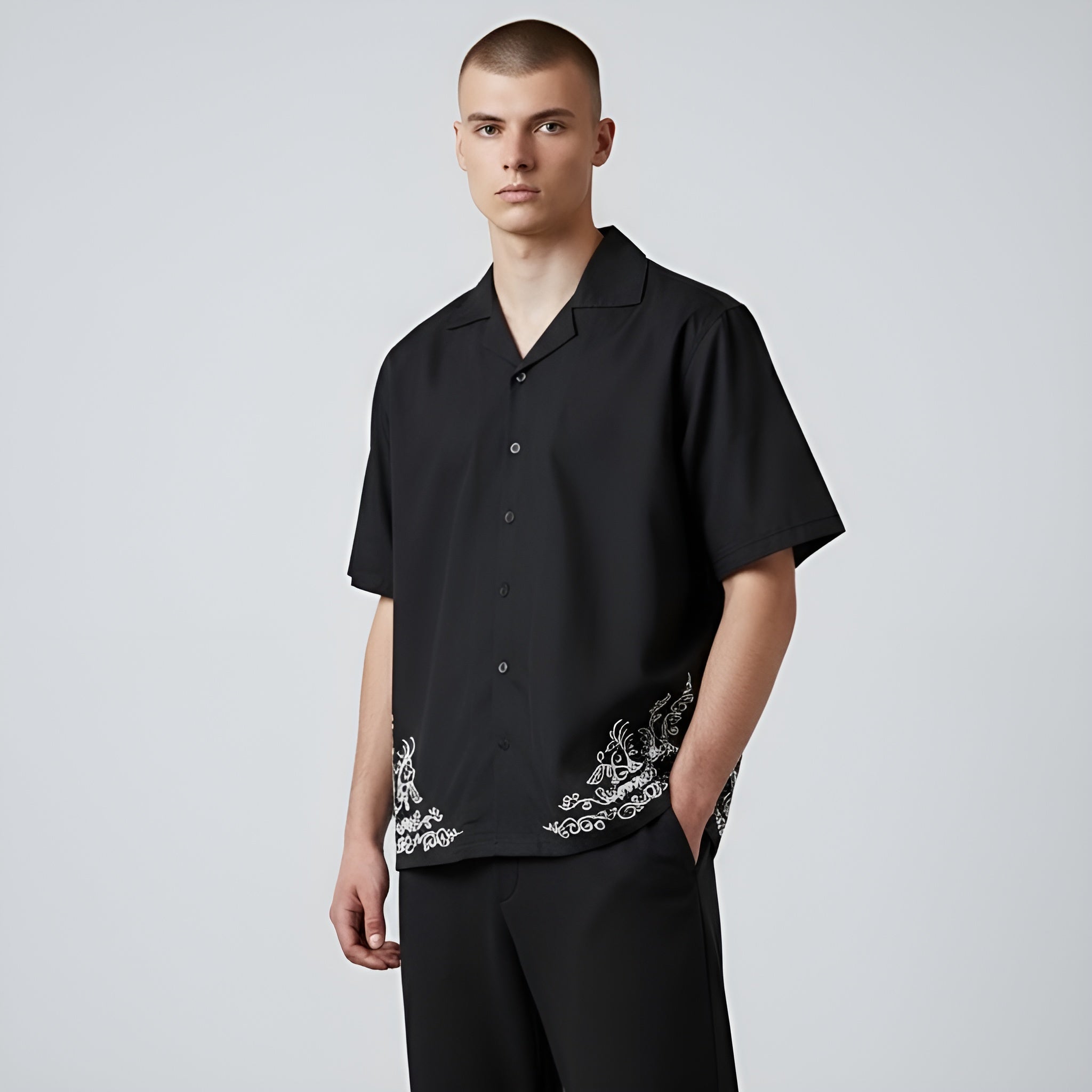 A relaxed fit black shirt featuring intricate white embroidered patterns. Crafted from soft fabric it blends comfort...